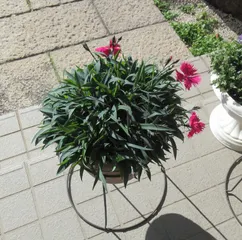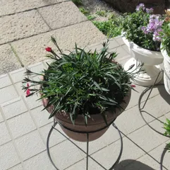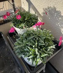 2年目爛漫なでしこの今の様子 あかいろ ももいろ2年目 10号鉢野ざらし雨ざらし、先日は雪もうっすら積もりました❄️あかいろは元気です😆ももいろは秋の長雨で傷んだところがあり取り除いてるけど、まだちょっと調子悪いところが😅