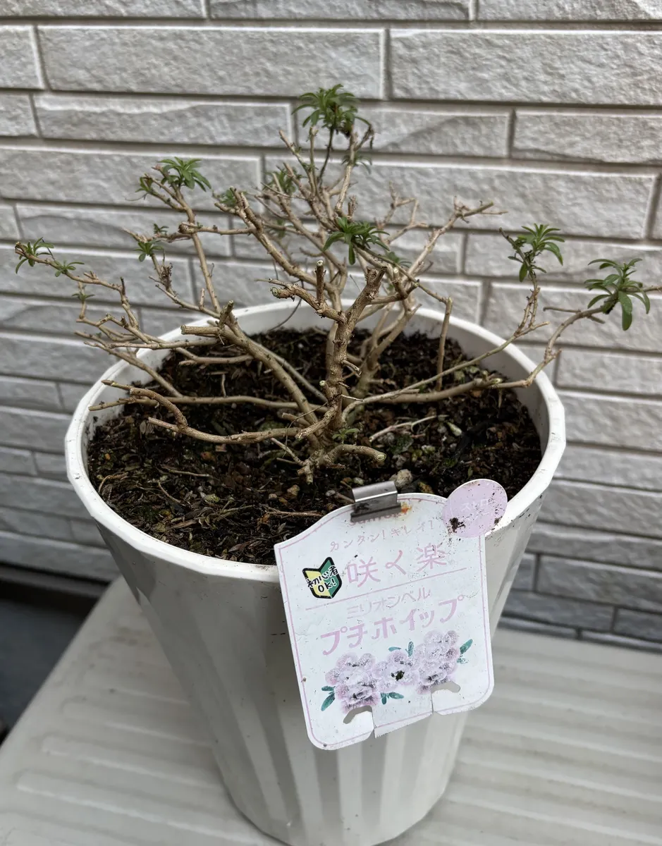 こちら2022年9月に購入した咲く楽ミリオンベルプチホイップストロベリー。冬越し4回目です。枯れるのを覚悟の上でこの冬は外管理してましたが、先日の寒波も何の対策もなしにダメージなさげです。