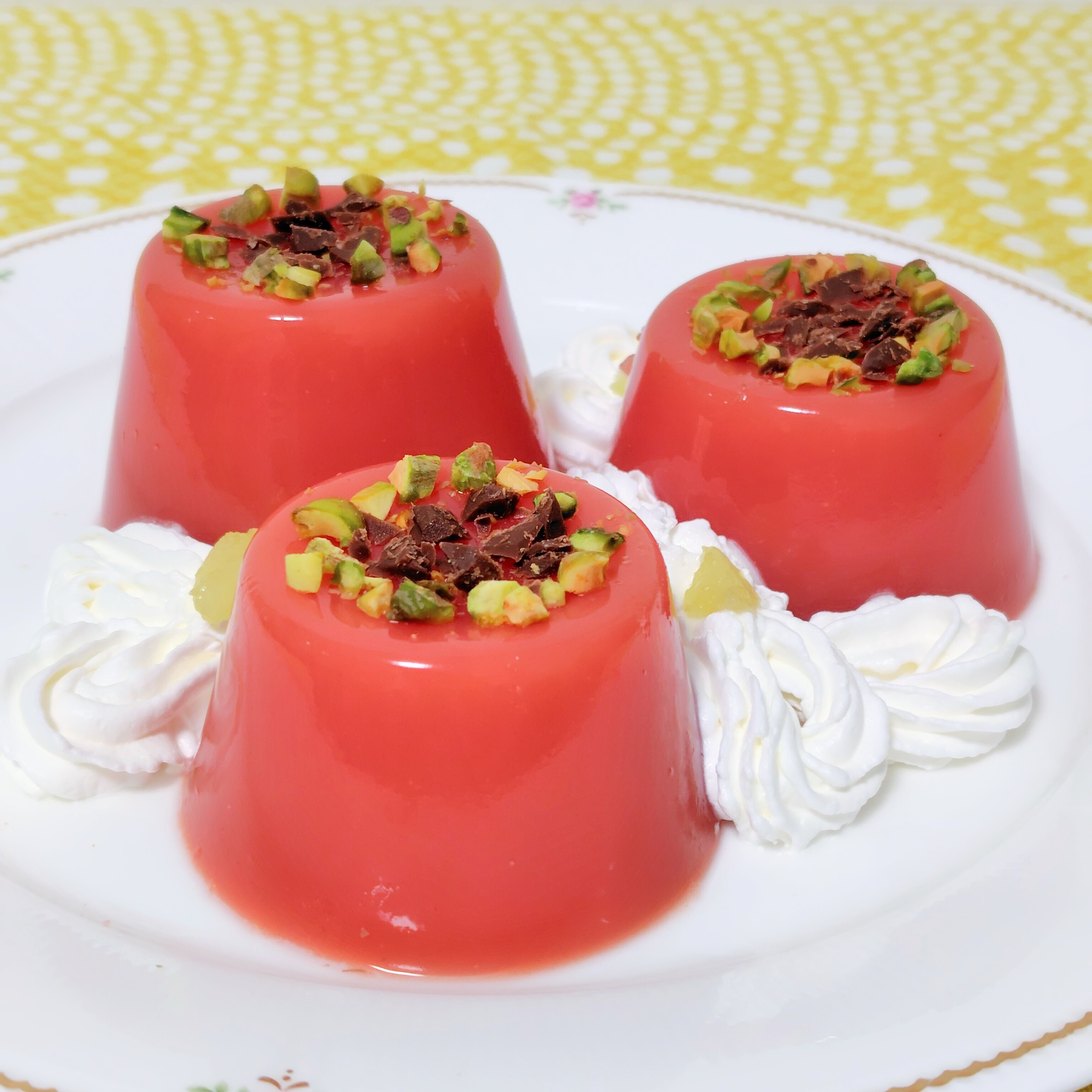 仕上げに緑のピスタチオとチョコチップを散らして、スイカのイメージカラーに仕上げます。食用花ジャスミンを添えることも。