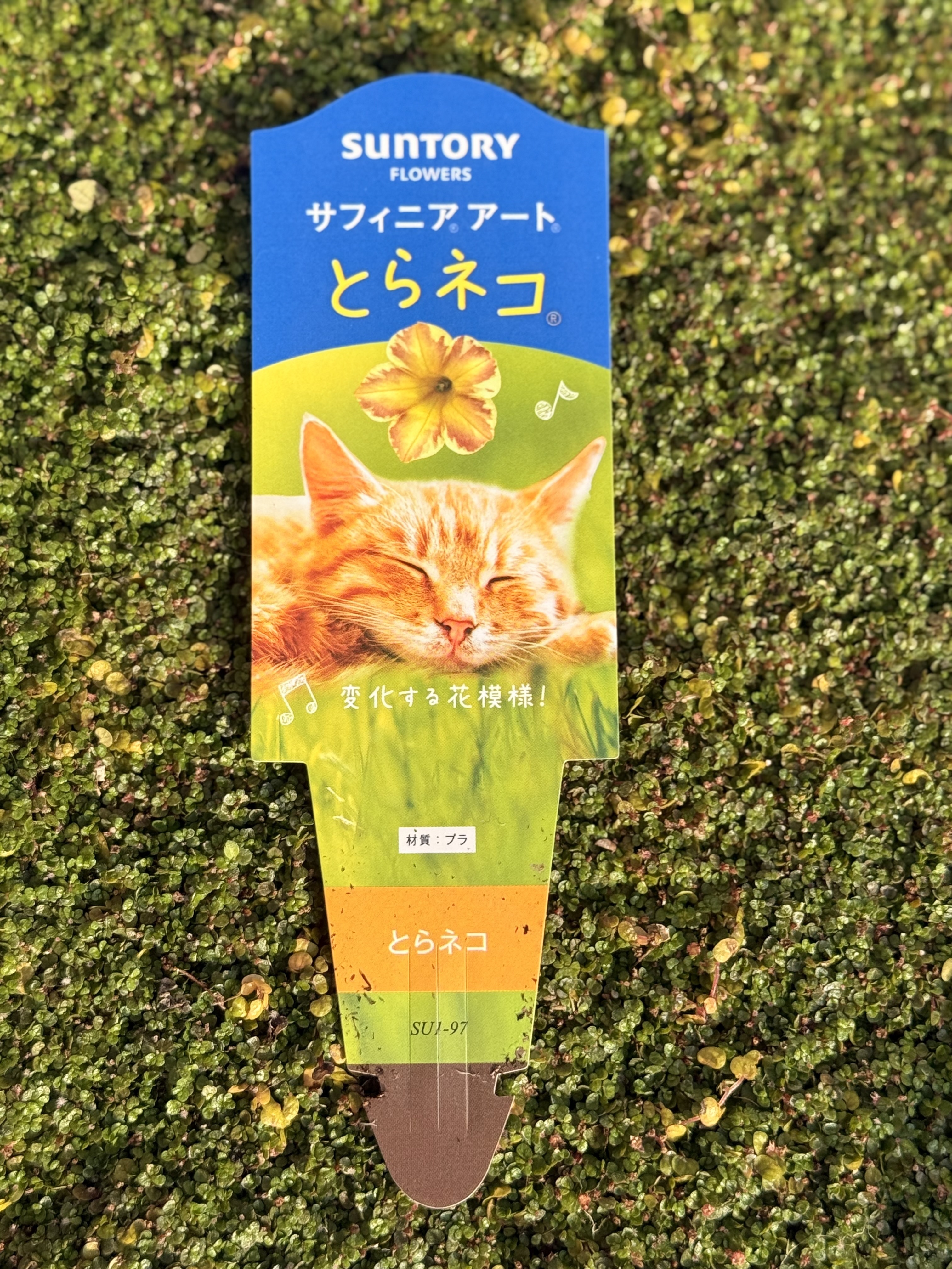 とらネコを単品で植え付けるつもりでいましたが 園芸店のInstagramにベビーティアーズシート入荷とあったのでとらネコのPOPみたいに緑の芝の上でとらネコが寝てる姿をイメージしてベビーティアーズシートの鉢を作ってそこに植え付けました