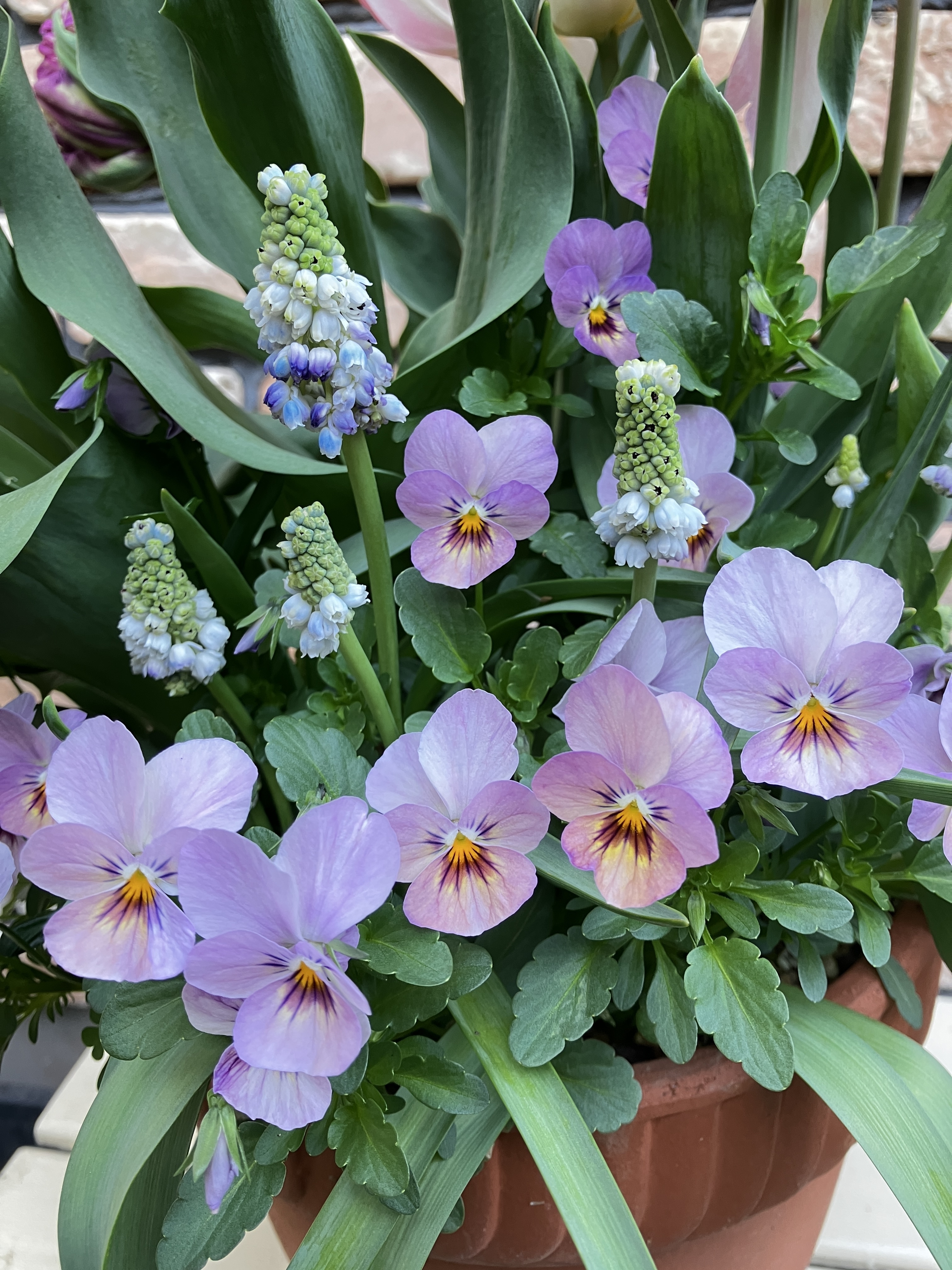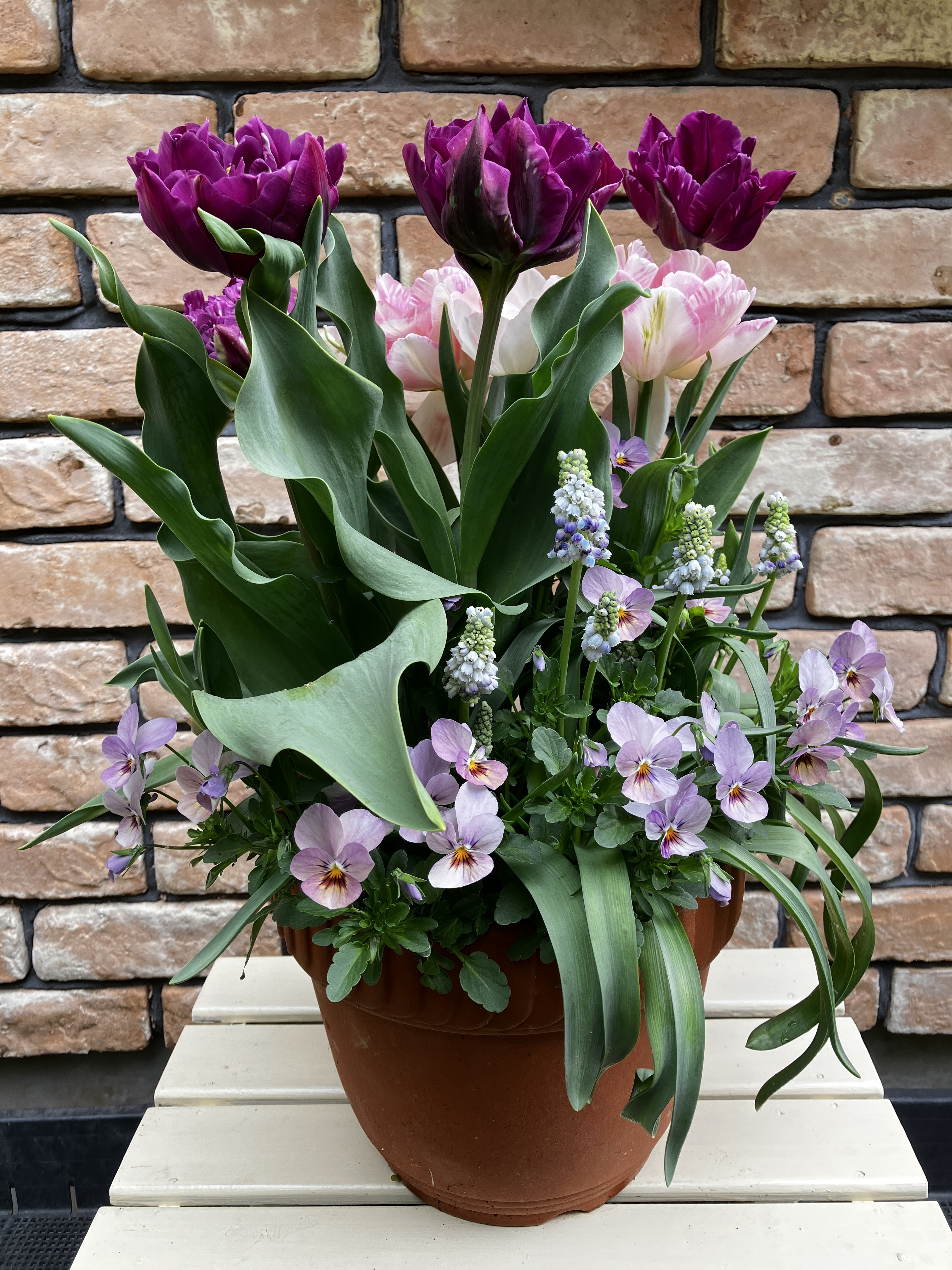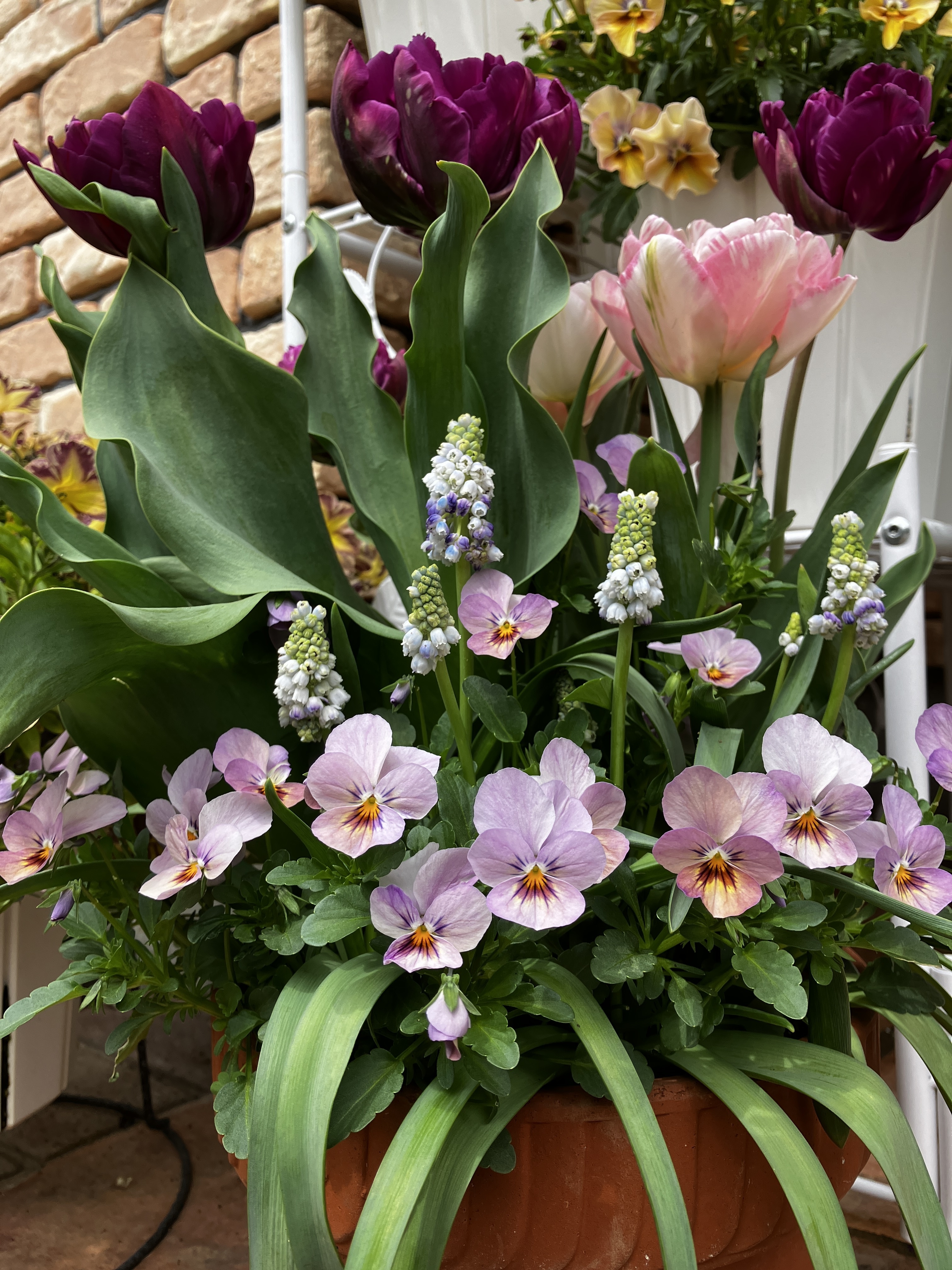 投稿を表示フィオリーナとチューリップ&ムスカリとの寄せ植え華やかでとても素敵ですね🩷🩷🩷