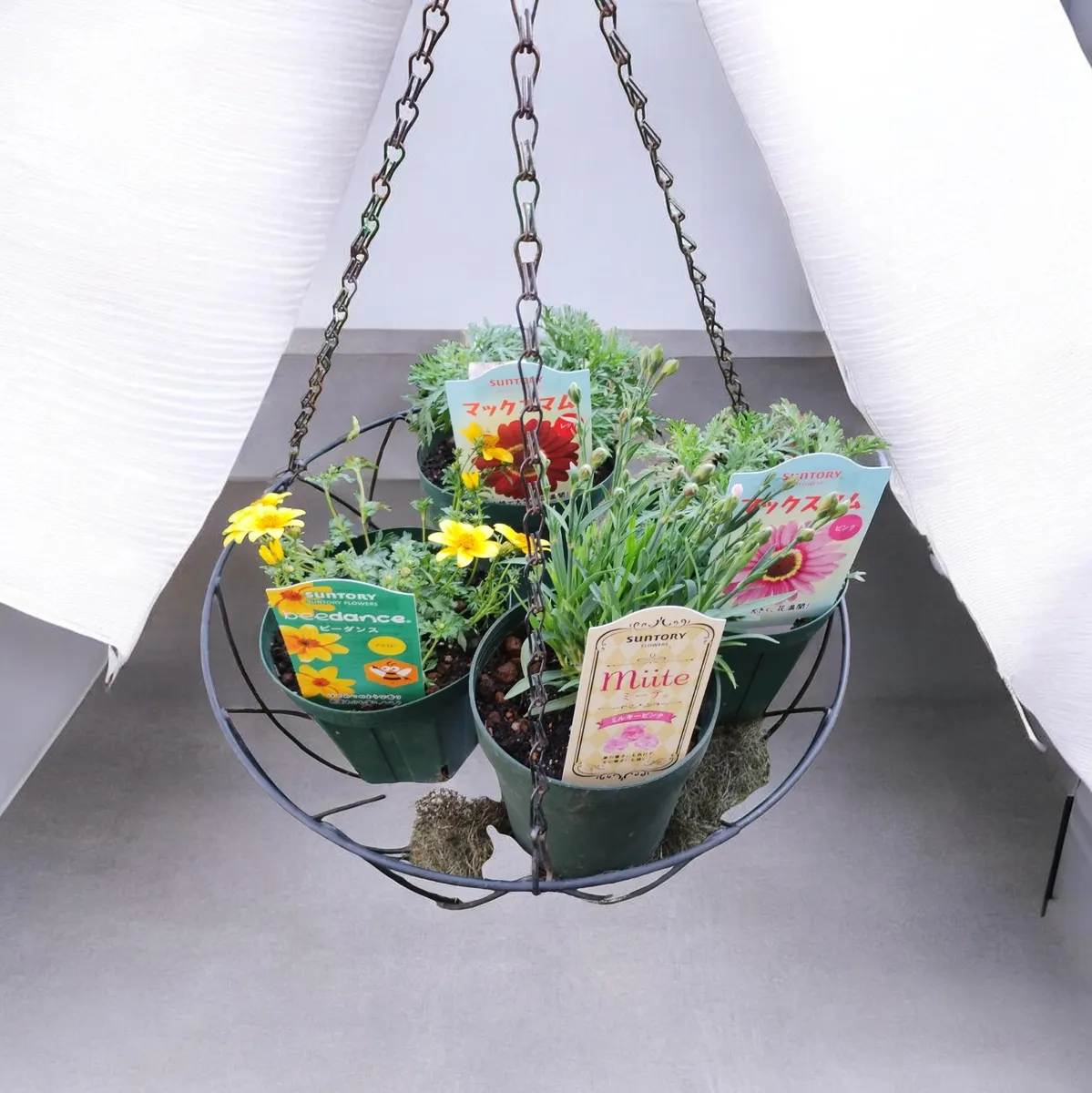 仮植えカルテットは35cmハンギングバスケットに4鉢入れて吊るしてますよ🤭