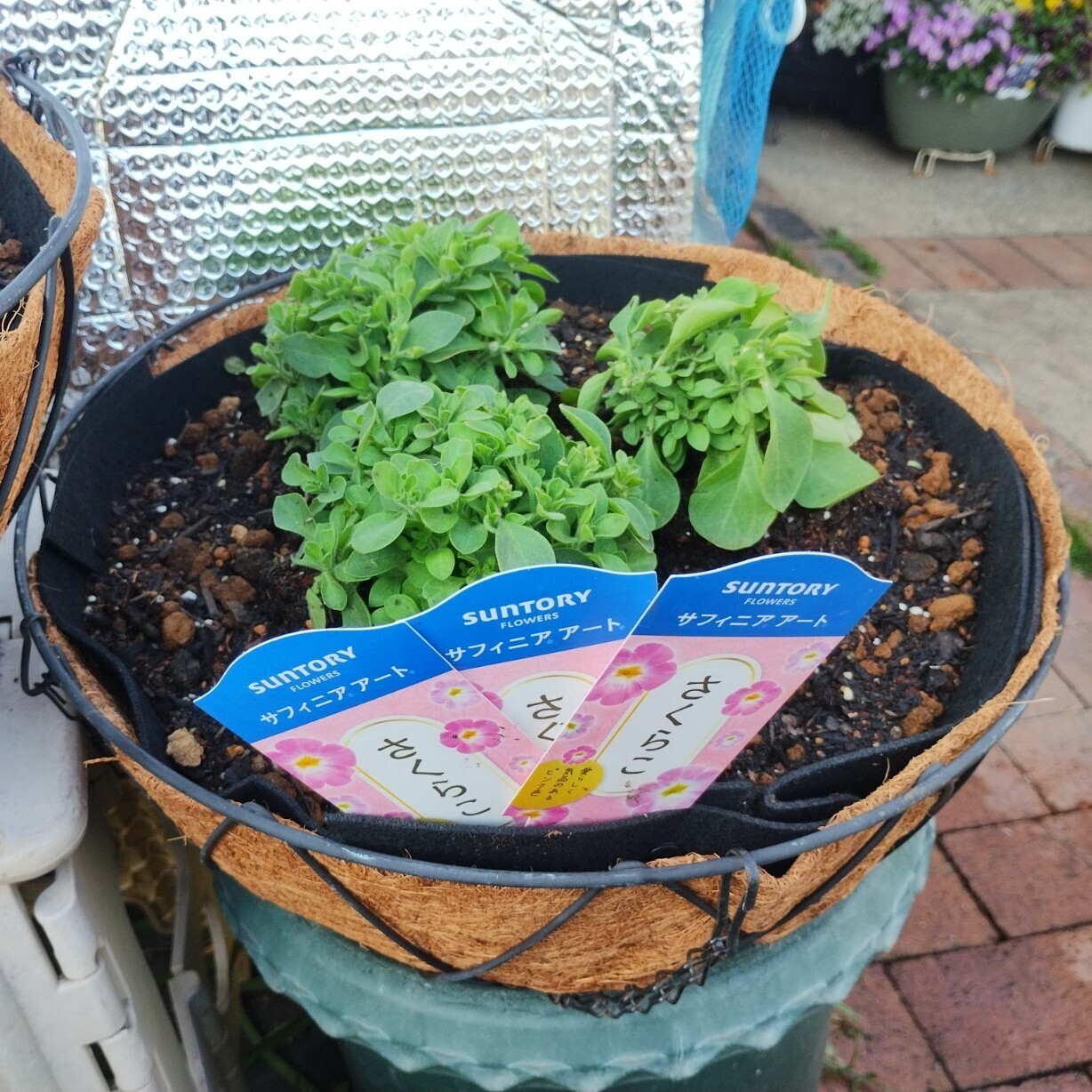 サフィニアアートは最初💦新商品のさくらこ🌸の3株植えをハンギングバスケットにしようと思ってたのに😅同じ新商品のコーラルチークも増やしちゃったし😅他にもね💦💦