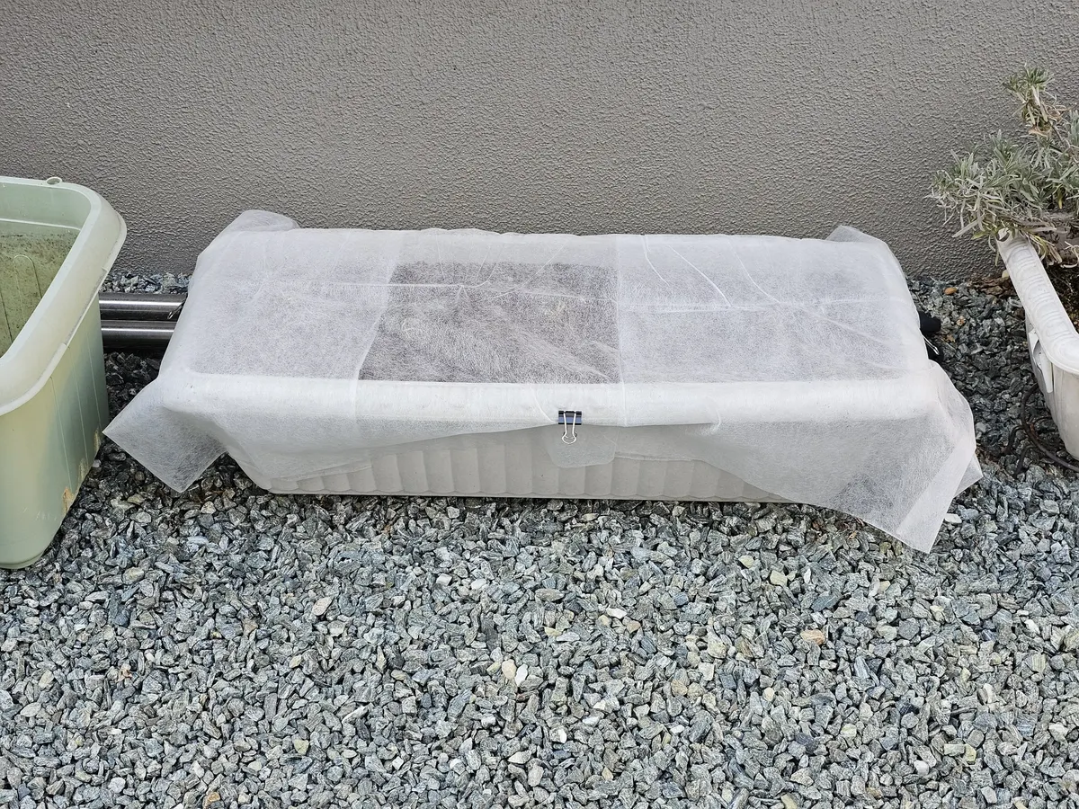 不織布を掛けてクリップで留めているのは野良猫にイタズラされないためです。
