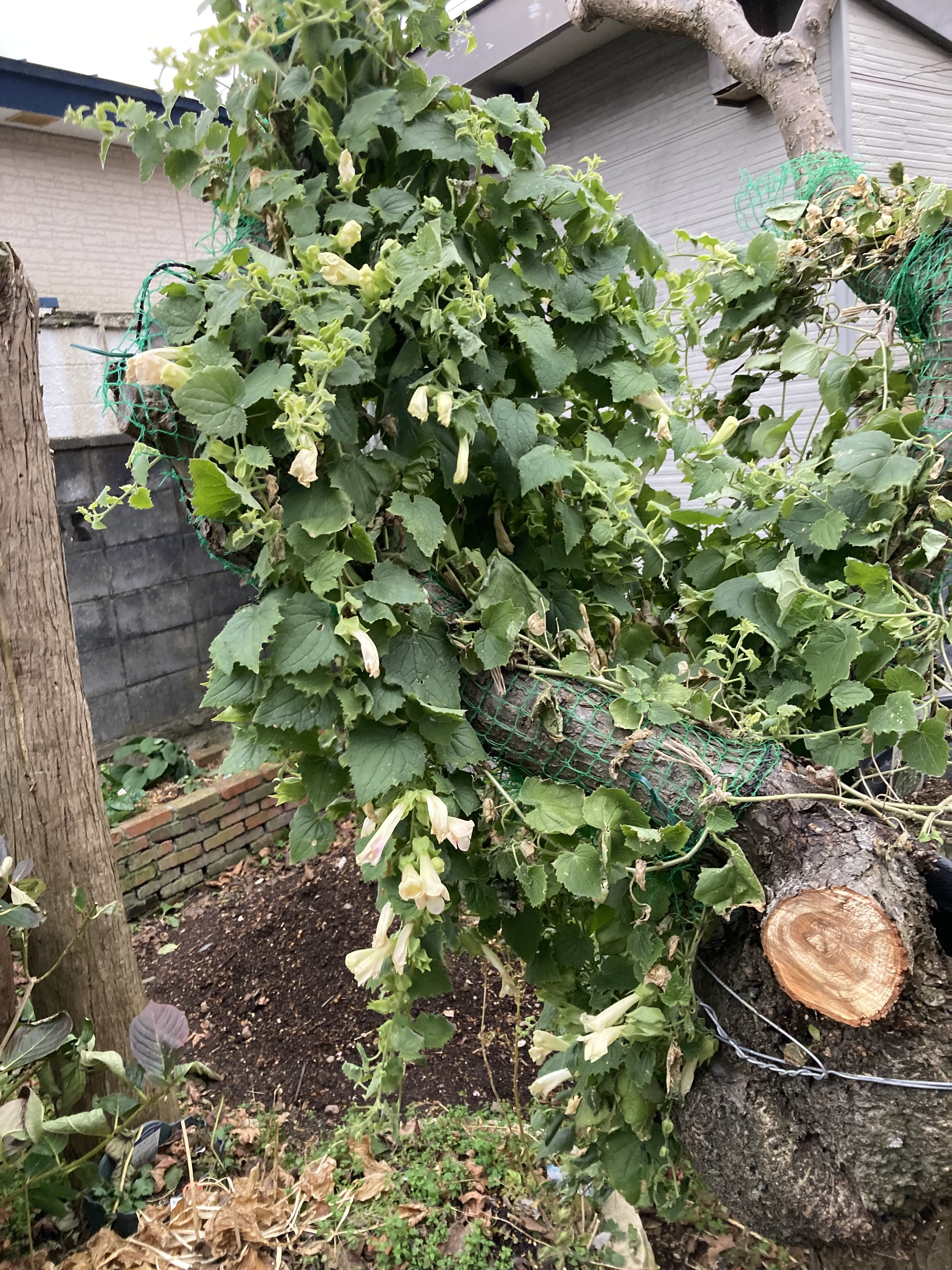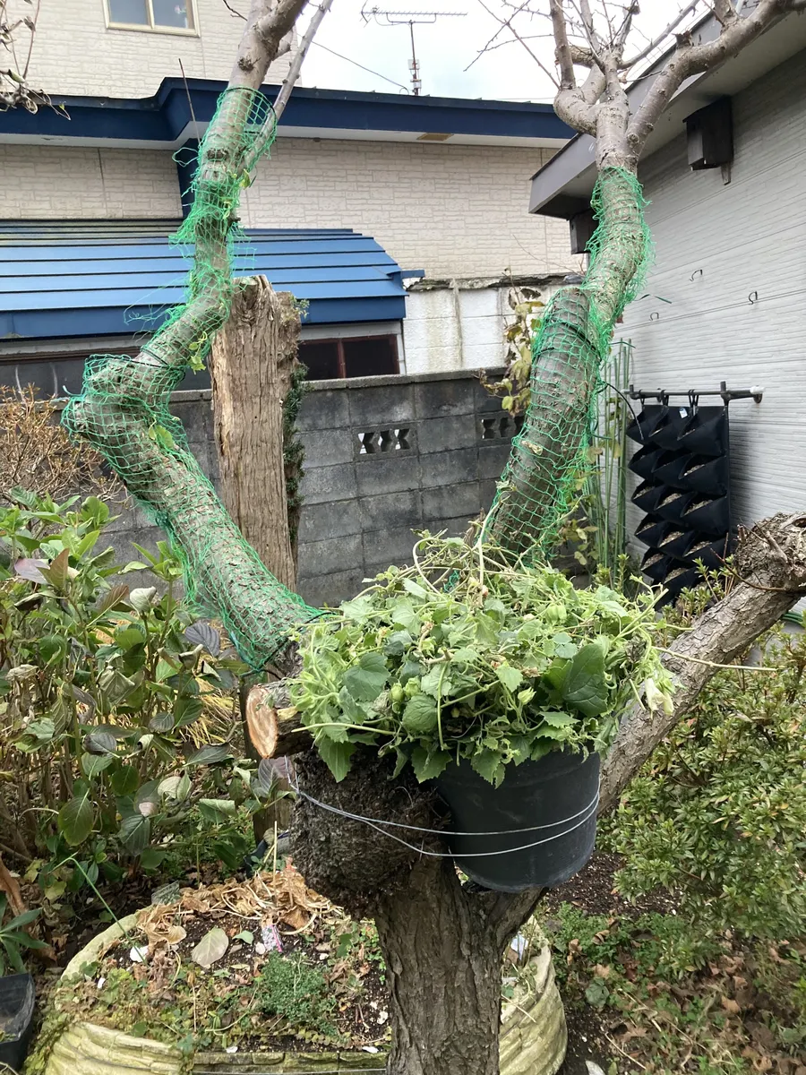 もう北海道では最低気温が氷点下になる中でも花を上げてくれています。梅の木の幹にくくりつけた鉢から登る子 しだれる子 沢山の花を上げてくれました。サンフラの中で最もパフォーマンスを発揮してくれた子だと思います。今日はいよいよお別れしました。 根は鉢いっぱいに伸びていました。もしかしてと思い株を小さくして冬越しチャレンジする事にしました。 ツルを外してみたらこんなにも淋しくなってしまいました。半年間 ありがとう💕💕💕