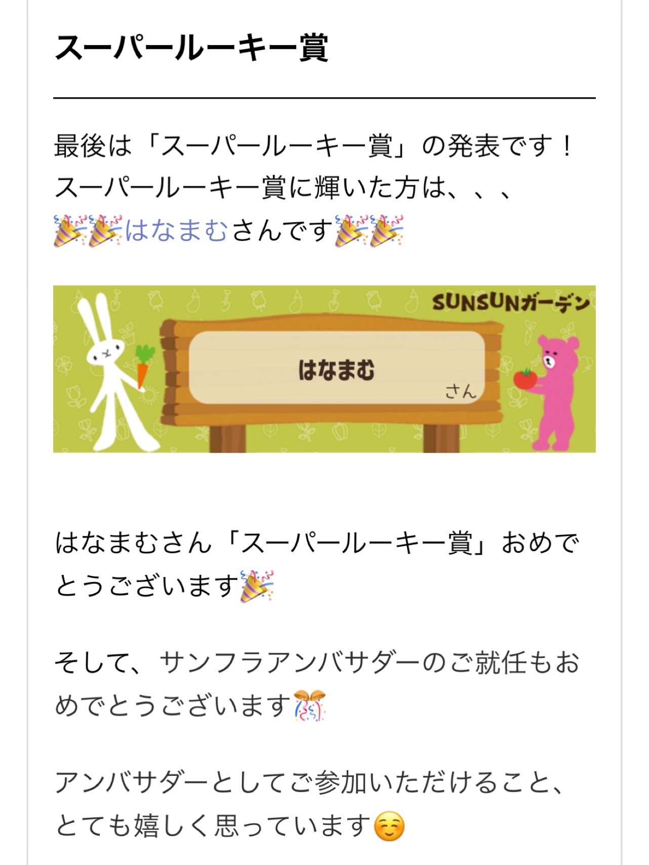 「SUNSUNアワードってなんだろう?」と思い拝読していたら最後に自分の名前が出てきたので一瞬フリーズ