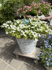 サンクエール こんにちは♪ サンクエール3色。夏を越しました。 ホワイト。 ディープブルー。 ブルーグラデーション。 私だけかもしれませんが、このお花、蒸れに弱い感じがします。雨に当たらないように軒下に置いていました。 7号鉢に1株植えです。