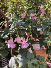 エンジェルスイヤリング 初めて育てるエンジェルスイヤリング 前回の投稿から1ヶ月気温が下がり花色も戻ってきて可愛らしいピンクと薄紫の2色になりました😊北側の日陰で何とか夏越し出来ました。 蕾もたくさん付いていて揺れるイヤリング姿をまだ楽しめそうです。
