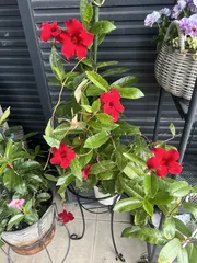 レスキューサンパラ🌺 8月のお盆休みにレスキューしたクライミングサンパラソルレッド2苗🌱🌱それぞれ鉢植えで育てています。とっても綺麗な赤いお花と艶ピカな葉っぱ12月中旬なので生長はしていないけどとても元気にみえます🌺すごい🤩