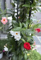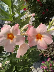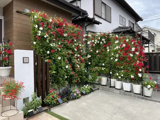 やっと3色揃い踏み クライミングサンパラソルのレッド、ホワイト、ピーチオレンジの3色植え。各々咲いてましたが、三色が同じ写真に収まったのは初めて🤳これから涼しくなってもっと沢山咲いてくれるかな🤔