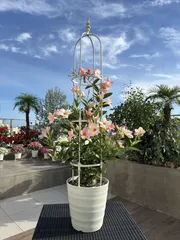 サンフラツインタワー クライミングサンパラソルとロフォスグランデのツインタワーです。クライミングサンパラソルは180cmのトレリス、ロフォスグランデは150cmのトレリスで育てています。クライミングサンパラソルはやっと花数が増えてきましたが、ロフォスグランデはお花は休んでます。サンフラさんによると真夏はお花が休むんだとか
