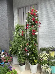 本領発揮してきました✨ 暑さが少しずつ和らいでくるに従って、ウチのクライミングサンパラソルも本領を発揮してきました。ぐんぐん蔓が伸びて行き場を失ってるのでもんもんさんみたいに追加の支柱を入れる予定😊だって、どんなに蔓を巻き直しても後ろの純あまの支柱に絡まりたがるんだもん😅