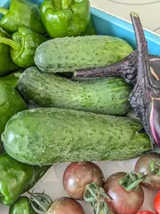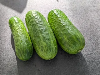 ポリッキュ、3本収穫✨ 1本育ちすぎましたが。 イイ感じです✨!ピクルスにして食べました😊 1本取り忘れてて、なすと同じ大きさ位になっちゃってましたが味も落ちず美味しかったです!なすと比較。