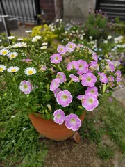 冬越しできた苗ですだいぶ咲いてきました〜☺️隣の花はノースポールこぼれ種ですももいろハート?だったかいちごシェイク?だったかわかりません😂去年両方買ったので