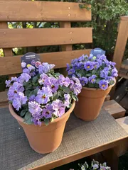 セネッティ 10月の植えつけ以来の投稿です😊今秋はラベンダーバイカラーとブルーをお迎えしていますここ2週間ほど、寒波や強風でほとんど外に出せてませんでしたが、開花してきました🌼 ラベンダーバイカラー💗一時、💗にだけアブラムシが大量に発生し、シャワーで洗い流した時に、少し茎が折れてしまいました😢下の方だ
