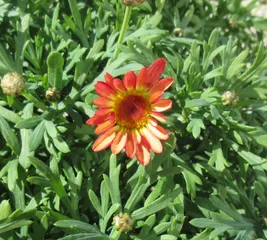 夏越しボンザマーガレット サンセットオレンジ開花 こんにちは♪ 夏越しサンセットオレンジ、開花しました。 数輪咲いています。 7号鉢に1株植え。 これは挿し芽苗なんです。2024年の秋に挿し芽、室内で育苗、2025年春に地植え、それを秋に抜いて鉢植えにしました。秋はあまりいい状態ではありませんでしたが、ここま