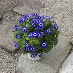 こんにちは♪ セネッティ ブルーバイカラー。花数が増えてきました。 8号鉢に1株植えです。 こちら地方、今日も雪が積もっていました。寒い日が多くて、お外に出せていません。ゆっくり開花しています。満開まで、時間がかかりそうです。 2026年1月20日