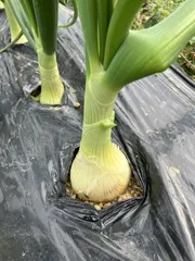 あまたま早生🧅の様子 あまたま早生が膨らんできました 玉ねぎらしいフォルムに🙌写真は1番大きくなってるものです🎶 とっても元気が良いです!早く収穫したいなぁ〜🧅 暖かくなってくるとサビ病やベト病に悩まされる年もありました今年は大丈夫かな?