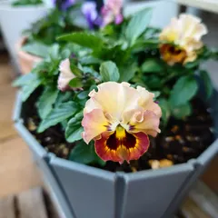 咲いた💛 今年はぐっと我慢して、寄せ植えの分も含めて5株お迎えしました。お迎えしてから、暑い日が続いた為、徒長してしまったので、摘芯して植え付けました。ぐらぐらしていた株もしっかりして、お花も1つを除いて咲いて来ました。植え付け後約1ヶ月たちます。