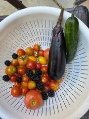 野菜いっぱい収穫されましたね😊 揚げ浸し美味しそう…私も大好きです😍 我が家のナスもそろそろ秋に向かって剪定したほうがいいのかな…今年は収穫量少なくて、秋にはいっぱい収穫したいです。😊