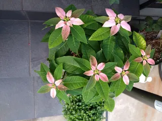 プリンセチア途中経過 ピンクになってきました〜。葉の大きさは小さいですが、ちょっと感動です。