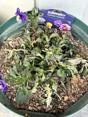 寄せ植えのウインティーと成長おもわしくないミルフル 寄せ植えにしていたウインティーのブルーピコティの花数が増えてきました💜ただ ウインティーの手前にミルフルを3苗植えてるんですが成長が思わしくなくて...この鉢の大きさに苗を詰め込み過ぎたかな💦