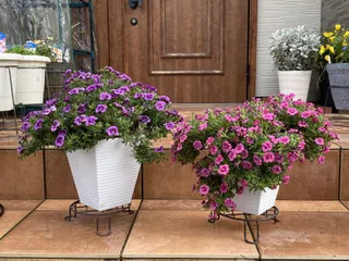 2年目ミリオンベルハンディもりもり🥰 2年目ミリオンベルハンディのこんもりブルーとこんもりピンク😊もりもりで毎日見惚れています😌ピンクは昨年、4〜5回も風に煽られて転落の憂き目に遭い残暑厳しい中半日も根っこが露わになった状態で転がってた子。ダメ元で植え直して、復活😊冬越し前の切り戻し→あえなく終了が怖くて昨年秋から✂️入れてません😊こん