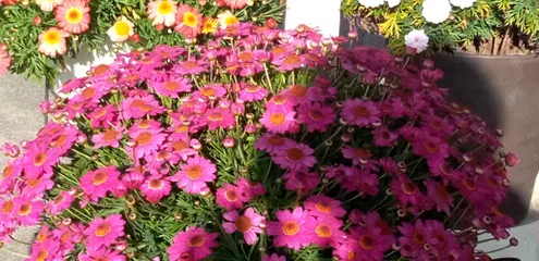 ボンザマーガレットたち移動 今日お天気よかったので今まで玄関横の軒下で待機していたボンザマーガレットたちをミルフルやフィオリーナたちがいる日当たりの良い場所に移動しました。😊レモンイエロー、今こんな感じです💛イチゴショートはやっと咲いてきました。まだまだ満開までの道のりは長そうです😅