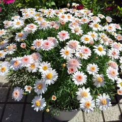 ボンちゃん2色目 ボンザマーガレット イチゴショート 2年目です🍓咲き始めは真ん中が少し赤くなるのがまた可愛いですね🍓