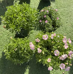 冬越しサフィニアたち 左上から時計回りで、とらネコ、さくらもこもこ、ももいろハートそして、どなたかわからなかったけど、ももいろハートのようです🩷この子は、レスキュー苗?挿し芽?分かりませんが、ももちゃんです😊