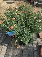 ボンザマーガレットサンセットオレンジ 夏越しできた親株ボンザマーガレットで大きな株のままで夏越しできたのはサンセットオレンジだけでした🧡そして挿し芽もたくさん根が出たのはサンセットオレンジでした🍊ちゃんとラベルを付けていなかったので咲いてからのお楽しみでしたが4株がサンセットオレンジでした😁🤣合計5株のサンセットオレンジです(アイキャッ