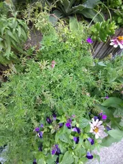 タピアン タピアンパープリッシュホワイト。絨毯のように引き詰められて綺麗ですよね。我が家ではハンギングでひと苗、昨年購入したのがやっと咲き出しました。絨毯のようにはならないけれどぶら下がりゆらゆら揺れて見た目もまた可憐な感じが好きです。 それにしてもやっぱり徒長ぎみ。太陽の方に向こうむこうとするから