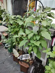 回復⤴️⤴️⤴️⤴️⤴️しました🍆 昨夜、旅行から帰宅後ノックアウト😵💫😵💫寸前だった、長ナスと満腹ナスは液肥+ストレスブロック🚿でシャキッとしてました🤭 さすがにあれだけしおれると、花も10輪足らず落ちてました😩 涼しくなってきたら実付き具合も良くなり、あちこち🍆🍆が出来てきました。普通ならナスの着果法則画あ