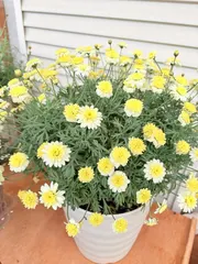 ボンザマーガレットレモンイエロー今咲いているマーガレットで一番お花が咲いてますうすい黄色で可愛いですとっても癒されます😻
