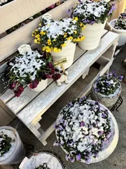 雪が積もってきました❄️ウインティーは軒下に入れたのですが風が吹き込んで、雪化粧してしまいました😆やっと咲いてきたウインティー達、折れませんように🙏