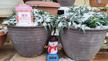NEW たのしモニター爛漫なでしこも⛄化粧 関東平野部普段雪の降らない内陸部からおはようございます⛄うっすらですが雪をまとった欄間なでしこちゃん達です😆🎵🎵蕾がピンクに🩷#たのしモニター#欄間モニター
