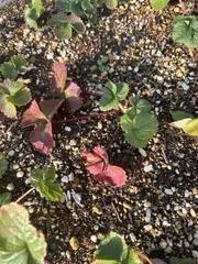 🍓いちご畑に遅めの紅葉、始まりました😆✨✨自作苗の方からゆるゆると。蜜香and白蜜香は外葉がなんとなく黄色味をおびてきた模様。
