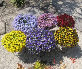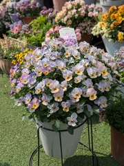 晴れの日のフィオリーナ フィオリーナたち。まだよく咲ていますが、明日の春の嵐で傷むでしょうね。花付きが抜群ですね。全て7号鉢に1株植え。もう液肥はあげていません。薄い活力剤をあげています。今日が見納めになるかも。2026年3月31日https://sunsungarden.jp/announcements/elhrqbz