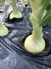あまたま早生!黒マルチに隠れていたのをのぞいてみました!結構大きくなってる🙌はかってみました8㎝超えてます❣️他のものはまだ8㎝以下収穫は7〜8㎝と掲載させてたのでもう収穫出来るサイズです💕後ははっぱが倒れるのを待つばかり💛🧅収穫のサイン🧅はっぱの根元が自然に柔らかくなり倒れます