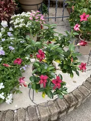 サンパラソル3色 ルージュアプリコットサンパラソルたち 6号鉢で頑張って咲いてますクリムゾンとルージュは、咲き進んで色褪せるとほぼ同じ色😂アプリコットはリング支柱の下のリングが外れちゃって、ただの棒3本誘引上手くできず麻紐でブランブランしてます😅