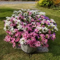 スターティアラ3色植え満開です🩷🤍💜 少し前にも投稿したスターティアラ 3色植えがさらに咲き進んで2回目の満開を迎えました🩷🤍💜ピンクがアンバサダー苗です🩷スターティアラは切り戻し不要だけど1回目の満開時ホワイトがのびのびしすぎて鉢から飛び出して花輪くんスタイルになっていたので1か月前に丸く形を整える程度にカットしていました💇♀️うん