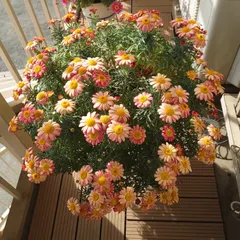 こちらも春の気温になってきました☀️ 今日のボンザマーガレットサンセットオレンジ2年目の様子です 昨年までは室内で管理してましたが今期の冬越しは外の簡易ビニールハウスの中でチャレンジしてました。鉢にはプチプチを巻いて発泡スチロールの箱の中に置いてました。 ですが、今月9