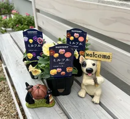 追加のお迎え🌸 こんにちは☀️花友さんと、フィオリーナのレッドフレアとブルーイエローを見つけに、某ユニディに行きました😁レッドフレア2株、ブルーイエロー1株お迎え🌸 ミルフルと目が合ってしまい、ミルフル2株、予定外のお迎えしました🤪 4号スリットに植えました😊株が小さいレッドフレア1株は3.5号