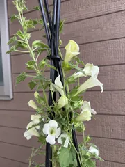 ロフォスグランデ ツルが沢山出てグイグイ伸びてきました♡ 蕾もたくさん✨ 輝くような真っ白なお花が可愛いです💕 涼しげ〜☺️ トレリスのてっぺん超えたのであとは垂らして育てます🫶🏻