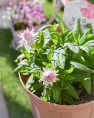 ボンザマーガレット ボンちゃんのイチゴショート🍓購入時蕾だけでやっとお花が1輪咲きました。あれ?イチゴショートってこういう感じだっけ?これからお花の中心が八重になっていくのかな🥰ほかにもクリームホワイトサンセットオレンジ🍊成長を見守ろうと思います
