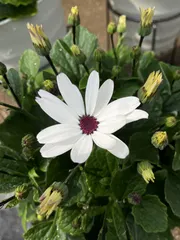 春苗セネッティ一番花が咲きました🌸 今朝ホワイトレッドアイの一番花が開花してました🙌蕾もたくさんでこれから楽しみです😊💕みんな順調に成長しています🌸✨秋苗に比べるホントにお手軽〜👍