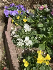 フィオリーナやっとここまで お値下げコーナーで爆買いしていた紳士の残り物を確保してきたフィオリーナたち🩵スカイブルー、💛ゴールドを2株ずつ冬の間日照時間の短い花壇でひっそりと耐え抜き、最近ようやくゴールドも咲き始めました💛まだまだフィオリーナらしい大きさではなく小さいけど、日が長く当たるようになってきたので、これから頑張ってほ