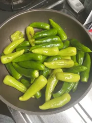8分です🍳 昨日取れたライムホルンです🫑 少しのオリーブオイルと水で蒸し焼きならぬ蒸し炒め?一緒に、愛してやまない日本ハムファイターズの系列商品シャウエッセンも蒸し焼き✨✨ 8分、水を差しながら火を通してその後ピーマンたちは、アゴ出汁塩をつけていただきます😆うまうま〜〜〜💕