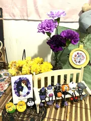 サンフラハロウィン🎃 ハッピーハロウィン👻ムーンダストが綺麗なうちに一足お先にサンフラハロウィン🎃ベンチに座って足ブラ仲間たちが「珍しい色のカーネーションだねー」とおしゃべりに夢中です。コロロジャンボバスも飛び入り参加です。